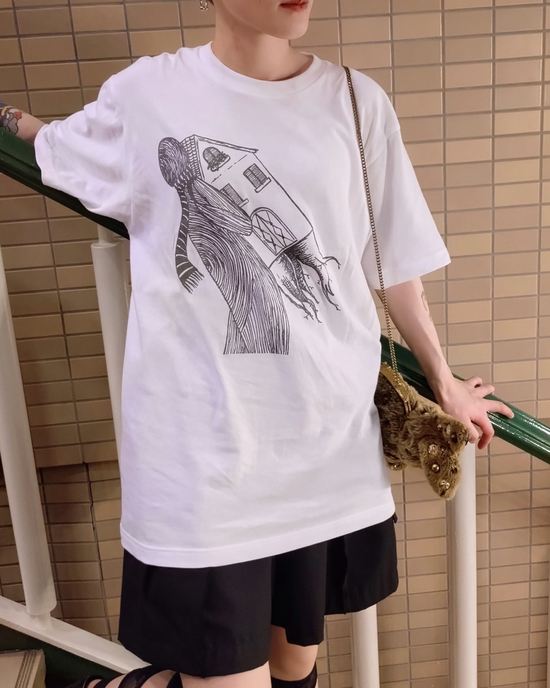顔と体が渦巻き状になった人が家を背負って歩くイラスト。家には根が生えており、イスラエルの攻撃によって愛する家を追われ、繰り返し避難を強いられる人々の心情が表現されている。白地のTシャツにラメ入りブラックインクのシルクスクリーンプリント。