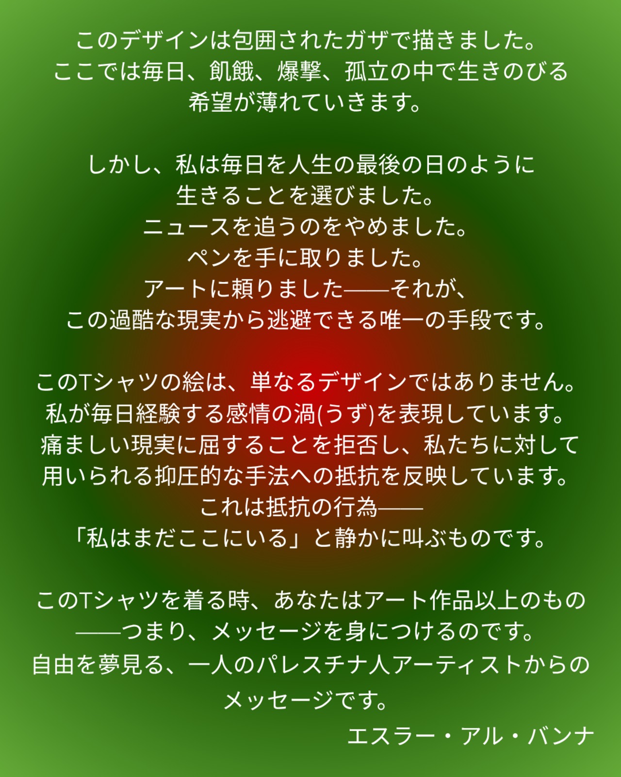 このTシャツを着る時、あなたはアート作品以上のもの——つまり、メッセージを身につけるのです。