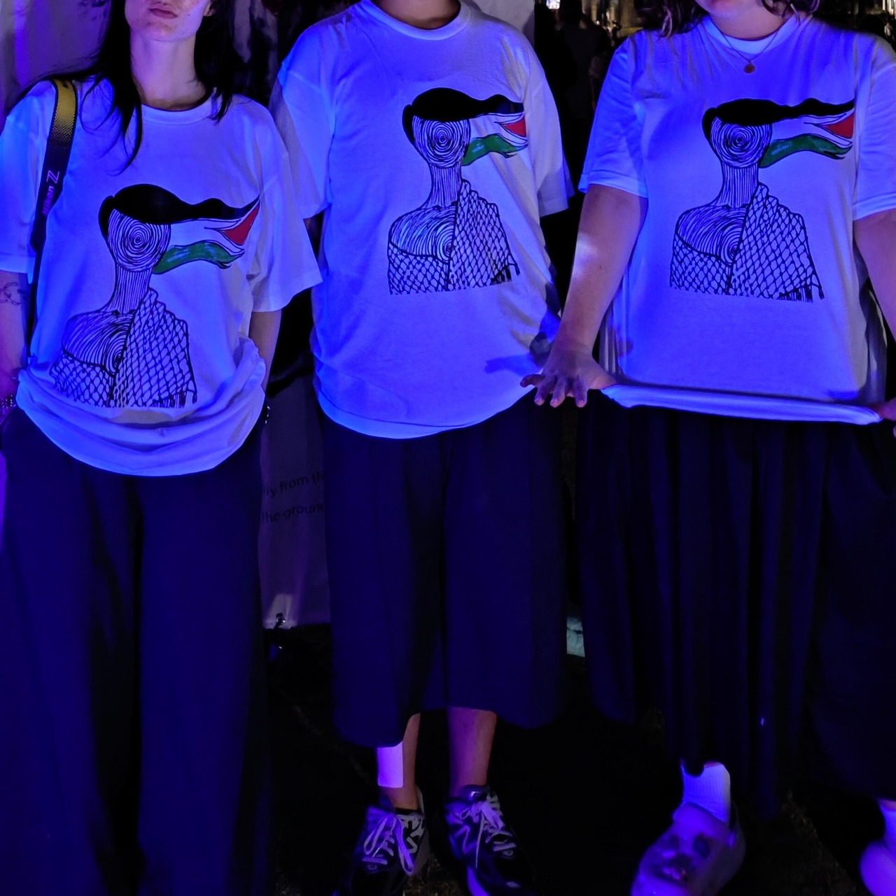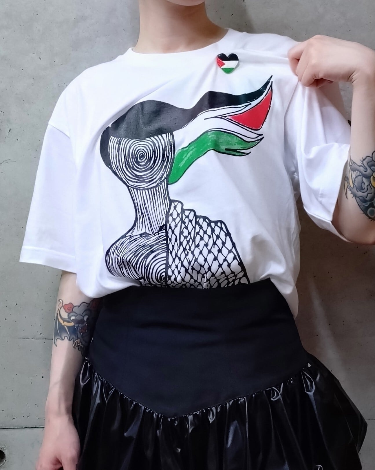 顔が渦巻き状になったクーフィーヤを巻いた女性が佇むイラスト。髪が風になびき、パレスチナの旗の模様が表現されている。白地のTシャツに黒・赤・緑のインクのシルクスクリーンプリント。